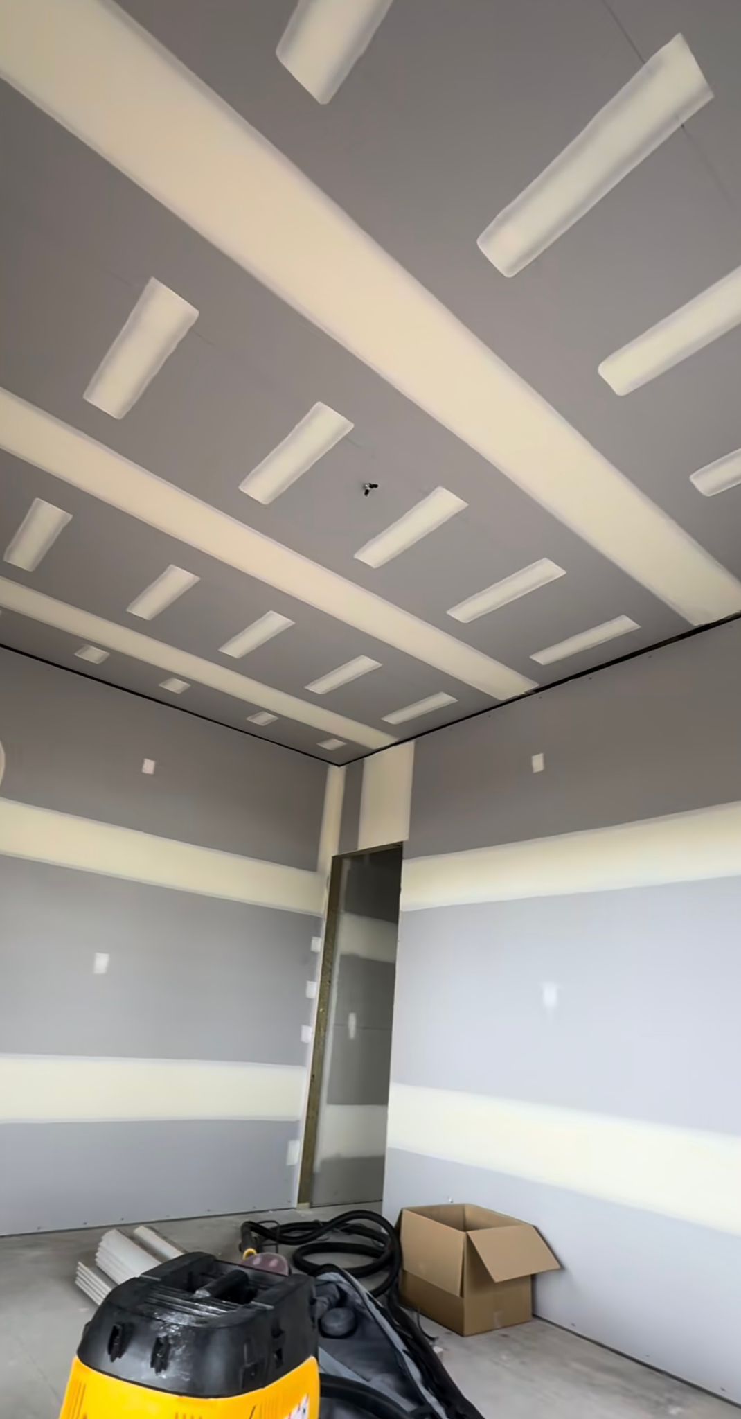 Seams are taped and covered with joint compound. The surface is then sanded for a smooth finish.